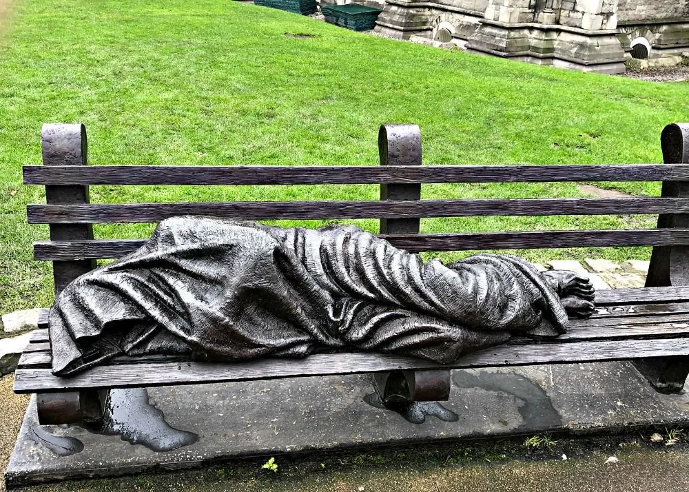 At first, the sculpture is easy to miss. It shows a figure lying on a bench, covered by a blanket. Only when you look more closely do you notice the wounds on the feet, revealing the figure as Jesus. Created by Canadian sculptor Timothy Schmalz, the artwork invites people to think about poverty, compassion, and how society treats those on the margins.
